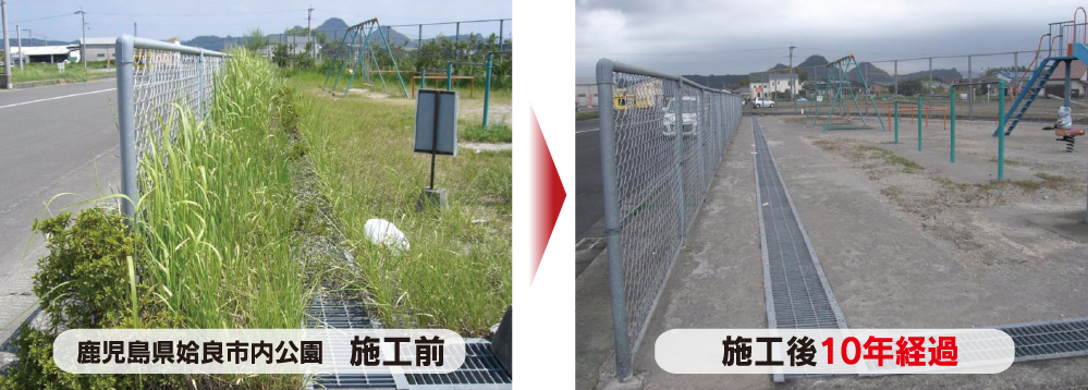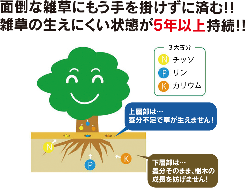 雑草が生える3大養分のチッソ・リン・カリウムを不溶化して防草。